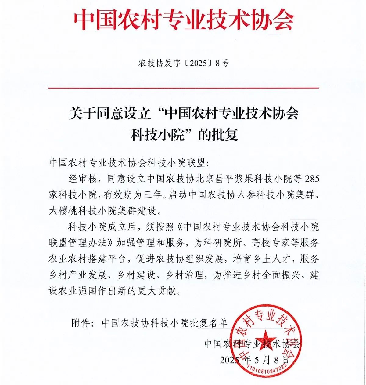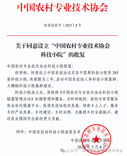 2025年5月8日,中国农村专业技术协会公布了《关于同意设立“中国农村专业技术协会科技小院”的批复》(农技协发字[2025]8号)文件,同意设立285家科技小院。江苏省获批20家国家级科技小院,其中淮安市获批2家。分别是依托淮安市淮安区百丰兴土地股份专业合作社的江苏淮安西瓜科技小院,首席专家是江苏徐淮地区淮阴农业科学研究所、淮阴工学院农学院兼职硕导孙玉东三级研究员;依托江苏天丰种业有限公司的江苏淮阴水稻科技小院,首席专家是淮阴工学院二级教授、淮安市农技协理事长张国良博导。