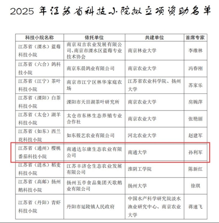 近日,江苏省科协发布《关于公布 2025 年江苏省科技小院名单的通知》,全省40 个江苏省科技小院得到认定、10 个江苏省科技小院得到立项资助。我校生命科学学院与江苏沿江地区农业科学研究所、南通达尔康生态农业有限公司联合共建的“江苏省(通州)樱桃番茄科技小院”成功入选并获得立项资助,生科院孙利军教授为该科技小院首席专家