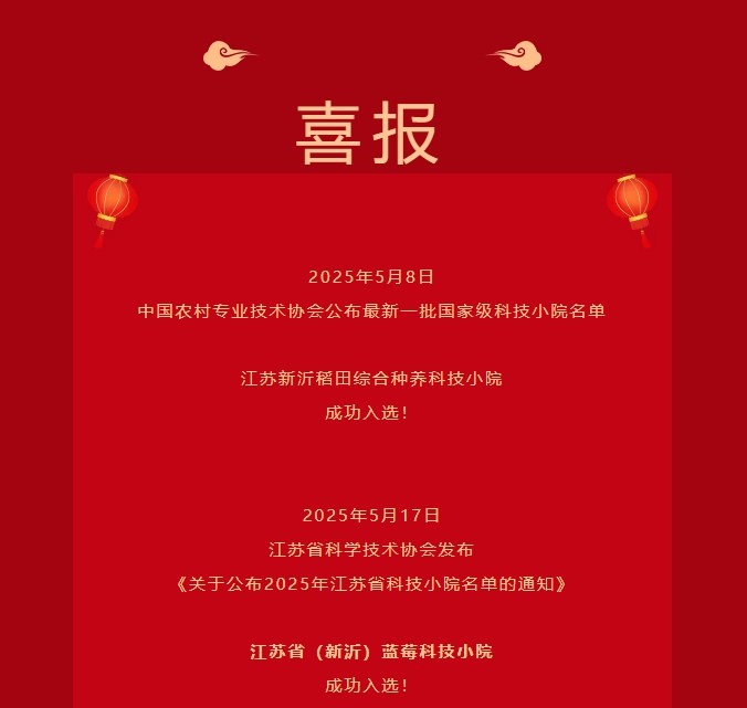 2025年5月8日中国农村专业技术协会公布最新一批国家级科技小院名单,江苏新沂稻田综合种养科技小院成功入选!2025年5月17日江苏省科学技术协会发布《关于公布2025年江苏省科技小院名单的通知》,江苏省(新沂)蓝莓科技小院成功入选!