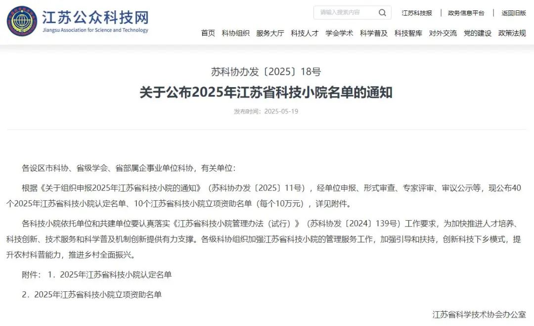 近日江苏省科学技术协会公示2025年江苏省科技小院拟认定名单